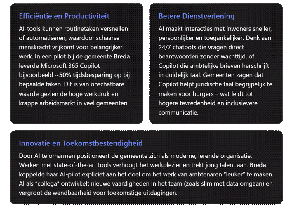 De ervaringen van voorlopers zoals Breda bewijzen dat AI niet alleen efficiëntiewinst oplevert, maar met de juiste aanpak ook enthousiast ontvangen wordt door medewerkers. Het komt erop aan te beginnen met een heldere visie en kleinschalige pilots: kies een concreet probleem of kans, stel een multidisciplinair team samen (betrek ICT, eindgebruikers, privacy/security-specialisten) en probeer het uit in de praktijk. Start bijvoorbeeld met een Copilot die vergadernotulen automatiseert in één afdeling, of met een eenvoudige Q\&A-chatbot voor de publieksbalie. Meet de resultaten (tijdswinst, gebruikerstevredenheid) en leer ervan. Zo’n quick win – bijvoorbeeld de 50% tijdsbesparing in Breda’s pilot – helpt om bredere steun te krijgen bij management en bestuur. Schaal daarna op naar andere afdelingen en deel kennis via netwerken als de VNG, zodat ook collega-gemeenten meekrijgen wat werkt. Belangrijk is om gedurende dit traject medewerkers mee te nemen met training en heldere communicatie: benadruk steeds dat AI bedoeld is om hen te ondersteunen en leuker te laten werken, niet om hen overbodig te maken. Die boodschap – van wethouders tot werkvloer – is essentieel voor draagvlak.