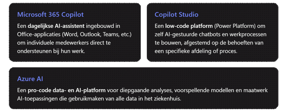 In dit artikel bespreken we hoe AI de zorg kan ondersteunen. We kijken naar concrete toepassingen van AI in het ziekenhuis – van het verlichten van administratie en het verbeteren van besluitvorming tot het persoonlijker maken van patiëntenzorg. We laten zien hoe Microsoft 365 Copilot, Copilot Studio en Azure AI – drie AI-oplossingen van Microsoft – elk op hun eigen manier waarde toevoegen. Ook gaan we in op belangrijke ethische en privacy-aspecten en geven we tips om als ziekenhuis met AI aan de slag te gaan. Ons doel is te inspireren: AI is geen bedreiging, maar een kans – een kans om met dezelfde mensen meer zorg te leveren, administratieve rompslomp te verminderen en innovatie te versnellen.